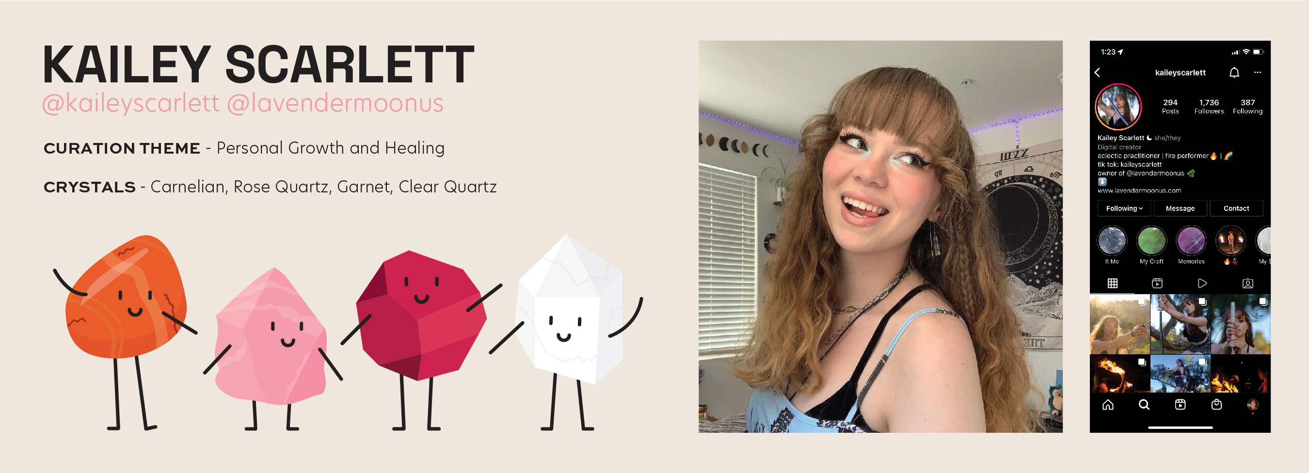 For this project I knew I really wanted to engage with the LGBTQ+ community. So I went on a search via Tik Tok and Instgram to find queer content creators within the crystal community. I let them curate roughly three to six crystals that fit within a theme/idea of their choosing. I used these curations to create matching crystal characters and to build out the packaging.
